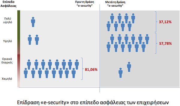 Το 81,06% των επιχειρήσεων που έλαβε μέρος στην έρευνα του «e-security» θεωρεί πως πριν από την επένδυση είχε χαμηλό έως οριακά επαρκές επίπεδο ψηφιακής ασφάλειας. Μετά την ολοκλήρωση της δράσης, τα ποσοστά εμφανίζονται σημαντικά βελτιωμένα, καθώς το 57,78% των επιχειρήσεων θεωρεί πως βρίσκεται πια σε υψηλό και το 37,12% σε πολύ υψηλό επίπεδο ασφαλείας.