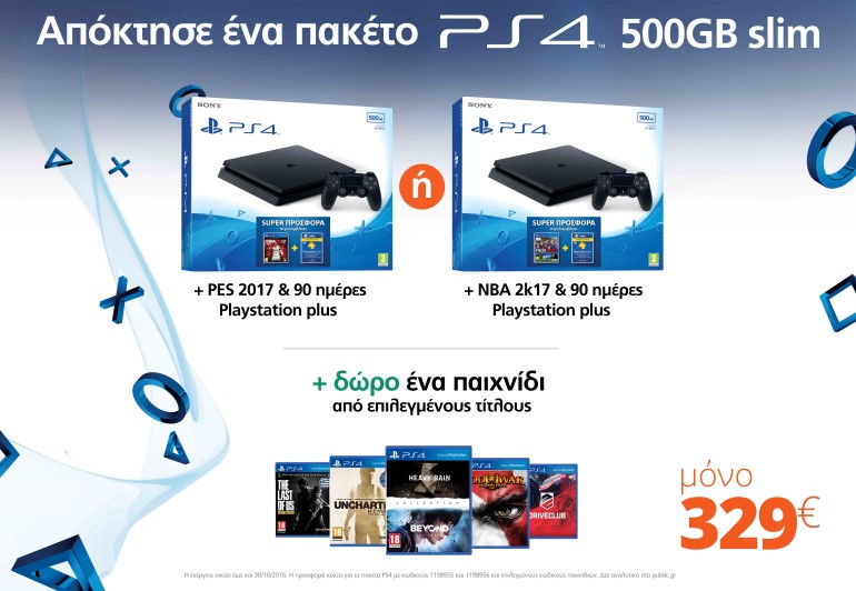 Τέλος, αν αναζητάς την κονσόλα Sony PlayStation 4 – 500GB Slim D Chassis απόκτησε τη τώρα από τα Public πακέτο με έναν από τους περιζήτητους αθλητικούς τίτλους της χρονιάς, NBA 2K17 ή PES 2017 και δώρο 3 μήνες PS Plus συνδρομή μόνο με 329€ και πάρε επιπλέον δώρο όποιο από τα παρακάτω games επιλέξεις: