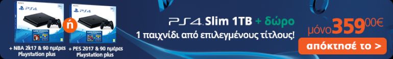Απόκτησε την κονσόλα PS4 1TB Slim και μαζί έναν από τους κορυφαίους τίτλους gaming της χρονιάς, μόνο με 359€. Λεπτότερο, ελαφρύτερο, εξίσου γοητευτικό, τo Playstation 4 Slim εγγυάται υψηλές επιδόσεις χάρη στον πανίσχυρο, ειδικά κατασκευασμένο επεξεργαστή AMD “Jaguar” με τους οκτώ πυρήνες, τη μνήμη συστήματος RAM 8GB GDDR5 και την κορυφαία μονάδα επεξεργασίας γραφικών (GPU) νέας γενιάς AMD Radeon, με συνολικά 1.84 Teraflops επεξεργαστικής ισχύος. Απόκτησε τη τώρα μαζί με έναν από τα παρακάτω hot games: PES 2017, NBA 2K17, MAFIA 3, FIFA 17, Rise of the Tomb Raider, Uncharted 4 μόνο με 359€ το πακέτο.