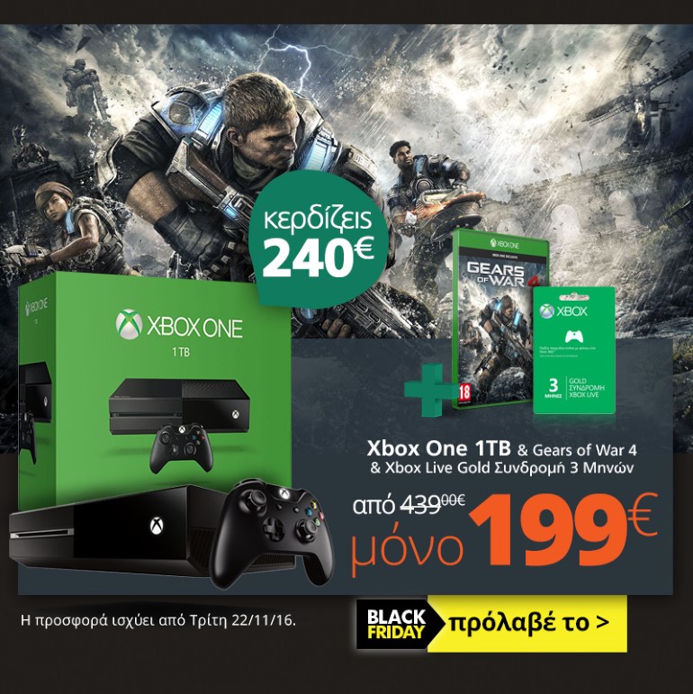 Η επόμενη εξαιρετική προσφορά αφορά την κονσόλα της Microsoft, Xbox One, η οποία δίνεται μαζί με το blockbuster, Gears of War 4, και θα το βρείτε στα 199€, με αρχική τιμή τα 439€.