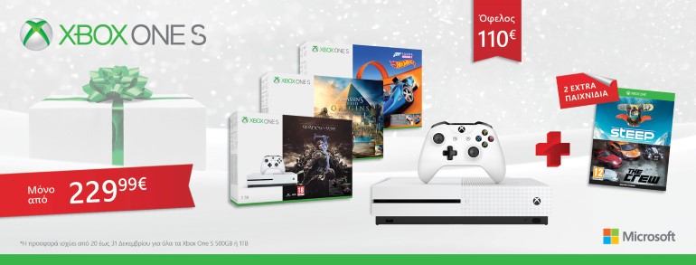Παράλληλα και μέχρι τις 31 Δεκεμβρίου, αποκτήστε όλα τα Xbox Οne S σε νέα μειωμένη τιμή (-50€) και δώρο το Steep, το χειμωνιάτικο παιχνίδι με extreme sports και το The Crew. Αυτά τα Χριστούγεννα, απογειώστε και εσείς την gaming εμπειρία σας με συνολικό κέρδος 110€ για όλα τα Xbox One S και βρείτε το Xbox One S 500GB από 279,99€ μόνο 229,99€ και το Xbox One S 1TB από 349,99€ μόνο 299,99€ και δώρο τους δύο δημοφιλείς τίτλους!