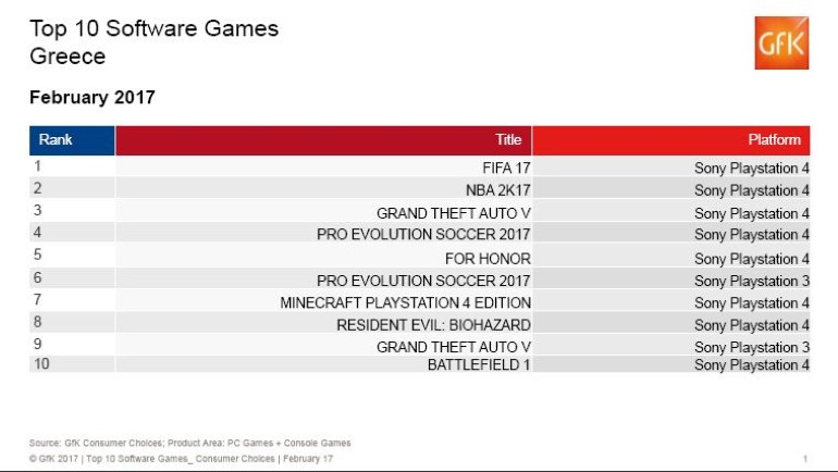 H αθλητική τριάδα όπως ήταν αναμενόμενο έχει πάρει τη θέση της στην πεντάδα και πάλι, με το FIFA 17 στην έκδοση PS4 για μία ακόμα φορά στην κορυφή, ενώ αυτή τη φορά η δεύτερη θέση ανήκει στο NBA 2K17. To GTA V έπεσε στην τρίτη θέση, ενώ έχουμε επιτέλους νέα κυκλοφορία εντός της πεντάδας και αυτό είναι το For Honor (Zougla.gr score: 8/10) από την Ubisoft. Η δεκάδα απαρτίζεται για μία ακόμα φορά από PS4 και PS3 τίτλους.