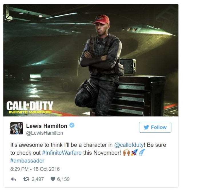 O πρωταθλητής της Formula 1, Lewis Hamilton, θα είναι ένας εκ των πρωταγωνιστών στο νέο Call of Duty: Infinite Warfare της Infinity Ward. Ο οδηγός της Mercedes ανακοίνωσε την εμφάνισή του στο Twitter, αλλά δεν ανέφερε επ’ ακριβώς το ρόλο του στο παιχνίδι.