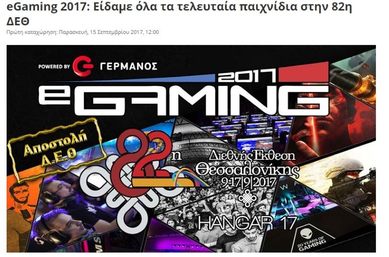 Με περισσότερους από 80.000 επισκέπτες και 2.585 συμμετοχές αθλητών σε 31 τουρνουά ολοκληρώθηκε στην 82η ΔΕΘ το eGaming 2017 powered by ΓΕΡΜΑΝΟΣ, το μεγαλύτερο gaming event των Βαλκανίων.