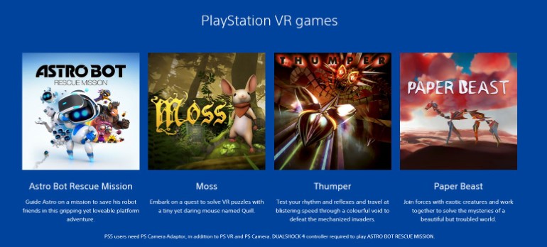 Από τα παραπάνω, οι χρήστες θα χρειαστούν το headset εικονικής πραγματικότητας, PlayStation VR, για να παίξουν τα: Astro Bot Rescue Mission, Moss και Paper Beast, ενώ τα Rez Infinite και Thumper μπορούν να παιχτούν με ή χωρίς PlayStation VR. Όλα τα υπόλοιπα είναι συμβατά με το PlayStation 4 και PlayStation 5.
