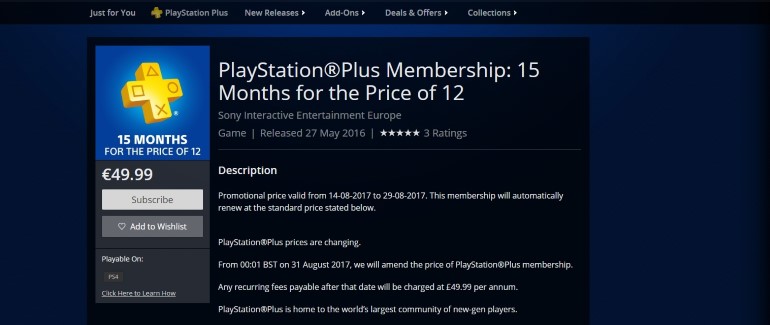 Πιο συγκεκριμένα, μέσω του Ευρωπαϊκού PlayStation Store, μπορείτε να αγοράσετε την ετήσια συνδρομή PlayStation Plus στα 49,99 €, αλλά αντί για 12 μήνες σας δίνει 15! Η συγκεκριμένη προσφορά θα ισχύσει μέχρι και τις 29 Αυγούστου. Αυτό ισχύει, είτε είστε παλιός είτε νέος χρήστης της συνδρομητικής υπηρεσίας της Sony.
