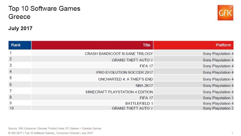 Όπως ήταν αναμενόμενο, ο Ιούλιος ανήκει στον Crash Bandicoot. Η remastered τριλογία ήδη από τον προηγούμενο μήνα, έχοντας κυκλοφορήσει στις 30 Ιουνίου, είχε καταφέρει μέσα σε μία μέρα να φτάσει την τρίτη θέση για τον Ιούνιο, άρα το περιμέναμε ότι θα βρίσκεται στην πρώτη θέση για τον Ιούλιο.