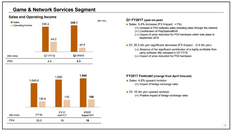 Όσον αφορά τα παιχνίδια και το PlayStation Network, όλα βαίνουν καλώς για την εταιρεία, και σε αυτό έχουν βοηθήσει οι πωλήσεις digital τίτλων, καθώς και το PlayStation VR, το οποίο έχει ξεπεράσει τα 1 εκατομμύριο πωληθέντα κομμάτια. Σημειώθηκε και μία πτώση στα έσοδα, η οποία στηρίζεται σε πρόσφατες μειώσεις της τιμής του PS4 και στην έλλειψη πολύ κερδοφόρων first party τίτλων για την κονσόλα αυτή την περίοδο (όπως το Uncharted 4: A Thief’s End το αντίστοιχο τρίμηνο του 2016).