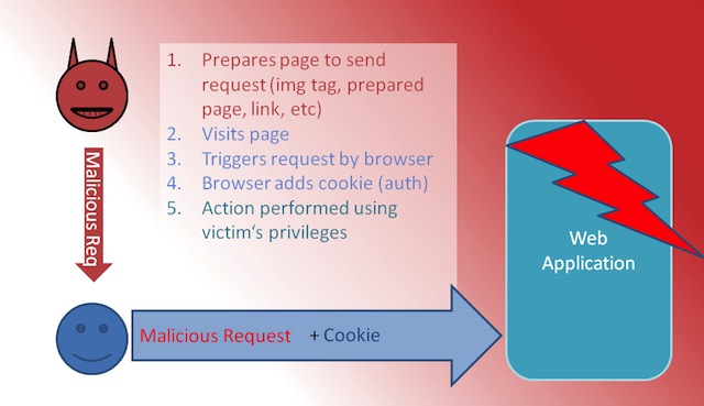 Μια επίθεση CSRF υποκλέπτει cookies των θυμάτων και άλλες πληροφορίες authentication, που χρησιμοποιούνται για την σύνδεση σε μια ευπαθή ιστοσελίδα. Μόλις ολοκληρωθεί η διαδικασία, ο εισβολέας μπορεί να ελέγξει τις κινήσεις/χρήσεις του θύματος, όπως για παράδειγμα σε μια τραπεζική ιστοσελίδα και να έχει τον πλήρη έλεγχο στο λογαριασμό.