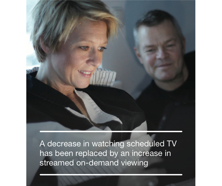 Μια βασική διαπίστωση είναι πως οι υπηρεσίες Video-on-Demand (VOD) καταφέρνουν να ικανοποιήσουν τις ανάγκες των καταναλωτών, επιτρέποντας τους να αλλάξουν τις συνήθειες παρακολούθησής τους. Οι καταναλωτές ξοδεύουν πλέον έξι ώρες την εβδομάδα παρακολουθώντας on-demand τηλεοπτικές σειρές, προγράμματα και ταινίες με streaming, μια προτίμηση που έχει υπερδιπλασιαστεί σε σχέση με το 2011. Με περιεχόμενο που εγγράφεται και λαμβάνεται online να προστίθεται στην εξίσωση, το 35% όλης της παρακολούθησης τηλεόρασης και βίντεο δαπανάται σήμερα στο VOD.