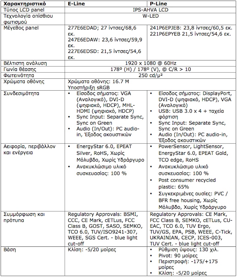 Οι οθόνες της E-Line 277E6EDAD στις 27 ίντσες, 247E6EDAW στις 23.6 ίντσες και 227E6EDSD στις 21.5 ίντσες είναι ήδη διαθέσιμες στα καταστήματα. Οι οθόνες της P-Line θα προστεθούν στην γκάμα οθονών των καταστημάτων αυτόν τον Σεπτέμβριο. Οι τιμές είναι οι ακόλουθες: E-Line 27” 277E6EDAD στα 279 ευρώ, E-Line 24” 247E6EDAW στα 199 ευρώ, E-Line 22” 227E6EDSD στα 159 ευρώ, P-Line 24” 241P6EPJEB στα 309 ευρώ και τέλος, P-Line 22” 221P6EPYEB στα 259 ευρώ.