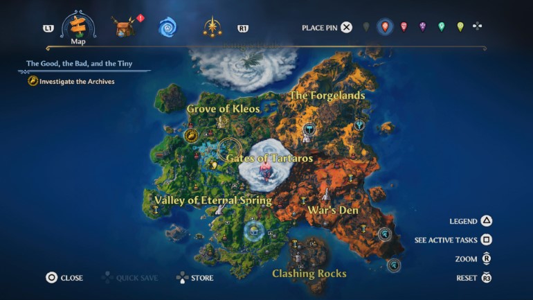 Ο χάρτης χωρίζεται σε τέσσερις βασικές περιοχές (συν άλλες δυο), όπου κάθε μία ξεχωρίζει ανάλογα με τον θεό που βρίσκεται εκεί. Για παράδειγμα η περιοχή της Αφροδίτης είναι γεμάτη λιβάδια, λίμνες, ζώα και χρώματα, ενώ η περιοχή του Άρη είναι γεμάτη πεδία μαχών, αίμα και τεράστια φρούρια. Κάθε περιοχή πέρα από το βασικό quest που αφορά την ελευθέρωση του εκάστοτε θεού, είναι γεμάτη με challenges και puzzles, κάποια (αν και ευτυχώς όχι πολλά) side-quests, τα Vaults of Tartaros που είναι μικρές περιοχές με platforming στοιχεία, αλλά και μυθικά Bosses. Γενικά δεν θα ξεμείνετε ποτέ από πράγματα να κάνετε, καθώς ο κόσμος του παιχνιδιού είναι αρκετά γεμάτος.
