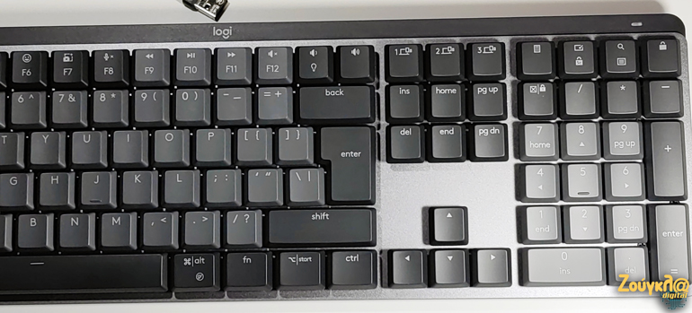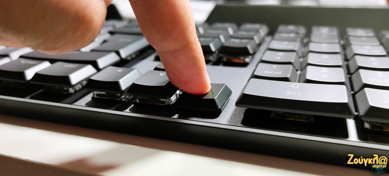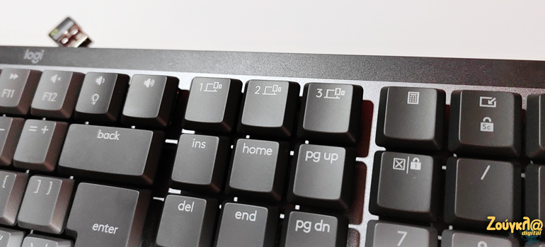 Τέλος, ακόμα ένα πολύ «δυνατό» σημείο του MX Mechanical είναι η δυνατότητα να συνδέεται σε 3 συσκευές ταυτόχρονα και να εναλλάσσεται με το πάτημα ενός κουμπιού άμεσα. Σας δίνει τη δυνατότητα είτε να συνδεθείτε μέσω του USB dongle (2.4 GHz) που δίνεται μαζί, το γνωστό Logi Bolt, που χρησιμοποιούν κι άλλα περιφερειακά της Logitech, είτε να συνδεθείτε μέσω Bluetooth. Συνδέσαμε το πληκτρολόγιο μέσω του dongle στο laptop μας και στη συνέχεια κρατώντας πατημένο το 2ο ειδικό πλήκτρο για 3 δευτερόλεπτα, ξεκίνησε ο εντοπισμός για το Bluetooth. Έτσι, το βρήκαμε και το συνδέσαμε με το tablet. Μετά, πατήσαμε και το τρίτο ειδικό πλήκτρο για 3 δευτερόλεπτα και κάναμε σύνδεση και με το κινητό μας. Αφού έγινε η σύνδεση με τις τρεις συσκευές, μπορούσαμε να αλλάξουμε τη συνδεδεμένη μας συσκευή με το απλό πάτημα αυτών των τριών πλήκτρων κατά βούληση και αστραπιαία. Τα πλήκτρα αυτά βρίσκονται πάνω από τα κουμπιά ins, home και page up. Πρόκειται σίγουρα για φοβερό πλεονέκτημα του πληκτρολογίου και είναι τρομερή και η ιδέα και η εκτέλεση. Τέλος, ακόμη ένα πλεονέκτημα έχει να κάνει με το γεγονός ότι το πληκτρολόγιο μπορεί να συνδεθεί τόσο με Windows, όσο και με MacOS, κάτι το οποίο επίσης δεν βρίσκουμε συχνά.