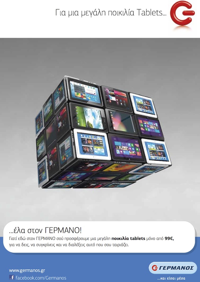 Στα καταστήματα ΓΕΡΜΑΝΟΣ οι λάτρεις της τεχνολογίας μπορούν πλέον να δουν, να συγκρίνουν τα χαρακτηριστικά και τις δυνατότητες πολλών tablet αλλά και να τα δοκιμάσουν. Μέσα από μία μεγάλη ποικιλία από τους σημαντικότερους κατασκευαστές, μπορούν να βρουν μοντέλα όπως τα Wi-Fi tablets Speed City All View, Google Nexus 7- ASUS 32GB, τα 3G+WiFi tablets ALCATEL One Touch Evo 7+3G Module, ASUS Fonepad 7’’ 3G ME371MG 16GB, SAMSUNG Galaxy Tab 2 10.1, για σερφάρισμα όπου κι αν βρίσκονται, καθώς και τα πρωτοποριακά 4G+WiFi tablets iPad mini, iPad με οθόνη Retina και SAMSUNG Galaxy Note 10.1 4G για απίστευτα γρήγορες ταχύτητες πλοήγησης.