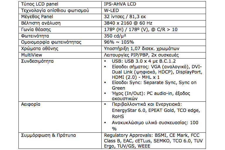 Επιπρόσθετα, τα ενσωματωμένα στερεοφωνικά ηχεία παρέχουν υψηλής ποιότητας ήχο που συμπληρώνει την εμπειρία θέασης. Η οθόνη διαθέτει επίσης τεχνολογία «MultiView», ώστε οι χρήστες να μπορούν ταυτόχρονα να αναπαράγουν περιεχόμενο από δύο διαφορετικές πηγές (πχ. PC και laptop, Mac και κονσόλα videogames) σε ξεχωριστά τμήματα της επιφάνειάς της. Χάρη στην πλούσια σε pixel UltraClear 4K ανάλυση, κάθε τμήμα διατηρεί συνεχώς την ευκρίνεια και τη φωτεινότητα του.