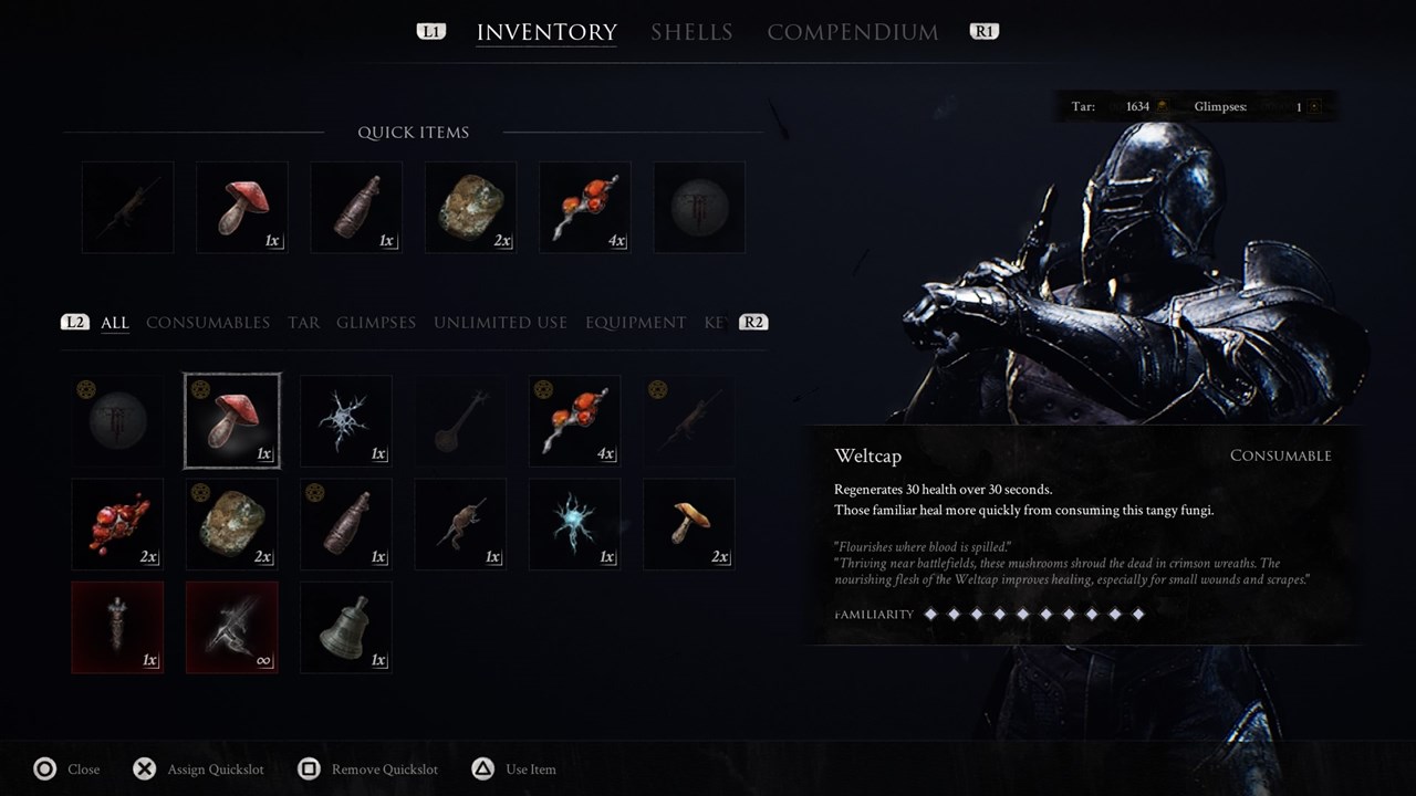 Πάνω από όλα, το Mortal Shell δεν έχει ένα σταθερό μέσο για να κάνετε heal (σαν το estus flask). Υπάρχουν διαφορετικοί τρόποι για να ανακτήσετε το HP σας, όμως όλοι κάνουν heal over time και όχι ένα συγκεκριμένο ποσοστό μόλις καταναλώσετε το αντικείμενο. Αν δεν προσέξετε είναι πολύ πιθανό ότι θα ξεμείνετε από healing items, για αυτό πάντα πρέπει να μαζεύετε ό,τι σχετικό βρίσκετε και να θυσιάζετε μερικά tar (το βασικό currency του παιχνιδιού) για να αγοράζετε επιπλέον αντικείμενα από τον αντίστοιχο vendor του παιχνιδιού.