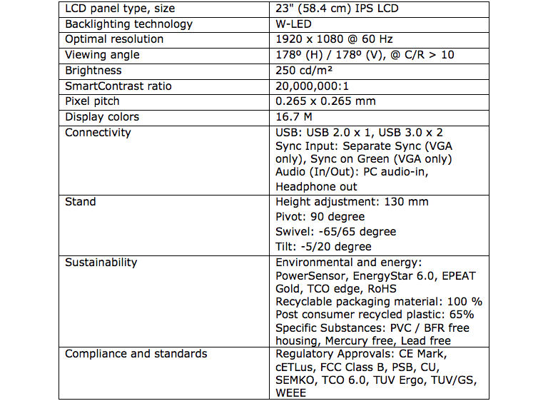 Η 23 ιντσών οθόνη έχει σχεδιαστεί για επαγγελματίες αλλά και απλούς χρήστες, που επιθυμούν να είναι παραγωγικοί σε όποιο μέρος και αν βρίσκονται. Με δύο ταχύτατες θύρες USB 3.0 και μία USB 2.0, οι χρήστες συνδέουν τον προσωπικό τους υπολογιστή στην οθόνη και αποκτούν άμεση πρόσβαση σε όλες τις συσκευές που συνδέονται αυτή, όπως εκτυπωτές, εξωτερικές μονάδες, φωτογραφική μηχανή ή ποντίκι, χαρακτηριστικό που εκτοξεύει την πρακτικότητα και ευκολία χρήσης του γραφείου ή/και προσωπικού χώρου.