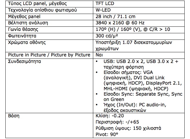 Τεχνικές Προδιαγραφές – Οθόνη Philips 288P6 LJEB 4K UltraClear UHD