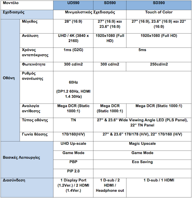 Οι οθόνες SD590 και SD390 είναι διαθέσιμες στην ελληνική αγορά από αρχές Μαΐου, ενώ η οθόνη UD590 UHD θα είναι διαθέσιμη το πρώτο δεκαπενθήμερο του Ιουνίου.