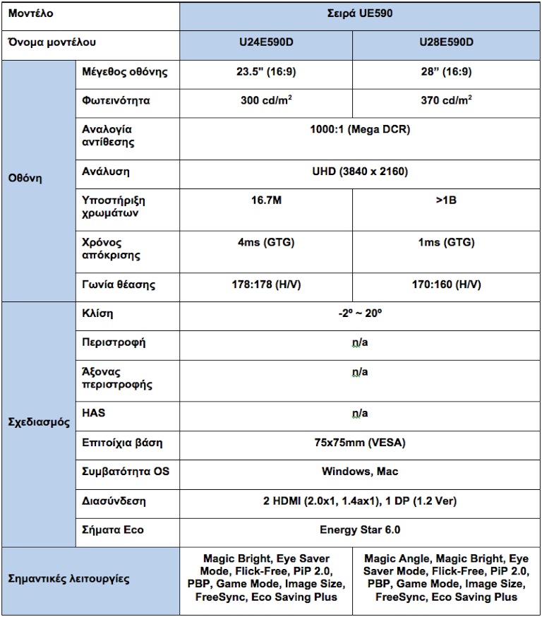 Με περισσότερα από 8 εκατομμύρια pixels και τέσσερις φορές την ευκρίνεια των Full High Definition (FHD) οθονών, οι οθόνες της σειράς UE590 προσφέρουν τις πλέον ζωντανές και λεπτομερείς εικόνες. Πρόκειται για τις μοναδικές UHD οθόνες που υποστηρίζουν την τεχνολογία «AMD FreeSync», η οποία συγχρονίζει το ρυθμό ανανέωσης (refresh rate) της οθόνης με το ρυθμό καρέ ανά δευτερόλεπτο (frame rate) της κάρτας γραφικών AMD του χρήστη, δημιουργώντας εξαιρετικές εμπειρίες gaming. Ο χρόνος απόκρισης μόλις ενός millisecond στο μοντέλο των 28 ιντσών, επιτρέπει επίσης στους gamer, να βλέπουν ακόμα και τις πιο γρήγορες σκηνές δράσης με απόλυτη ευκρίνεια, χωρίς θαμπάδα και είδωλα (φαινόμενο «ghosting»). Παράλληλα, το refresh rate των 60 Hz περιορίζει τις διακοπές (stutter) στην εικόνα και δημιουργεί μια βελτιωμένη και ομαλότερη εμπειρία.
