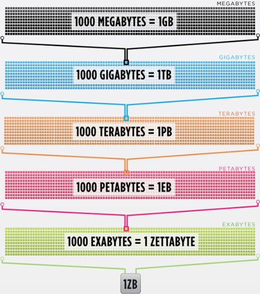 Με του ρυθμούς λοιπόν που παράγονται πάσης φύσεως δεδομένα, ο όγκος τους μόνο για το 2011 υπολογίζεται να ανέρθει στα 1,8 ZettaBytes. Επειδή είναι λογικό να μην είναι γνωστή η κλίμακα μέτρησης «Zetta» καθώς είναι «αστρονομική», αρκεί να αναφέρουμε ότι ένας τυπικός σκληρός δίσκος για σταθερούς υπολογιστές έχει χωρητικότητα (ήτοι ο όγκος δεδομένων που δύναται να αποθηκεύσει) που κυμαίνεται μεταξύ 500 GigaBytes έως και 1000 GigaBytes, όπου 1000 GB ισούνται αλλιώς με 1 TeraBytes.