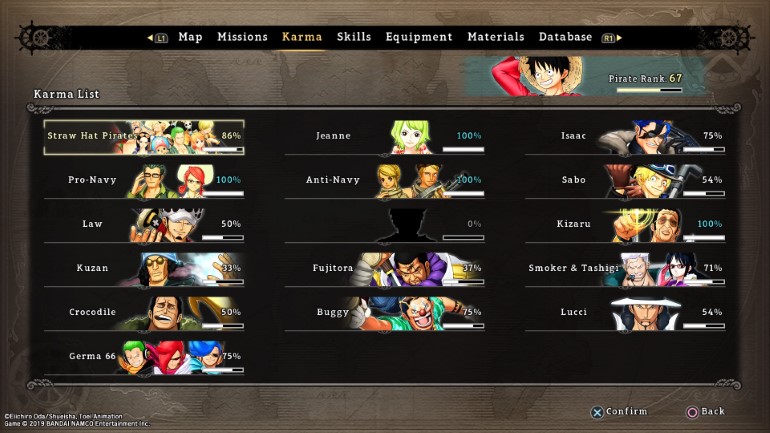 Αν και βαρετά, καλό είναι να κάνετε όσο πιο πολλά μπορείτε, καθώς σας ανταμείβουν τόσο με SP points, όσο και με συνταγές για craft αντικειμένων, ενώ ανεβάζουν και το Karma μεταξύ των χαρακτήρων του παιχνιδιού. Με τα SP points μπορείτε να ξεκλειδώσετε τις ικανότητες του Luffy μέσα από ένα αρκετά απλοϊκό, αλλά κατανοητό skill tree που διαθέτει όλες τις δυνάμεις, που έχουμε λατρέψει στο anime. Το Karma έχει να κάνει με το κατά πόσο είστε αρεστός στους άλλους χαρακτήρες και όσο ολοκληρώνετε quests και αυτό ανεβαίνει, τόσο περισσότερες επιλογές ξεκλειδώνουν, ενώ αν το πάτε 100% υπάρχει η πιθανότητα να δείτε κάποιο ειδικό cutscene.