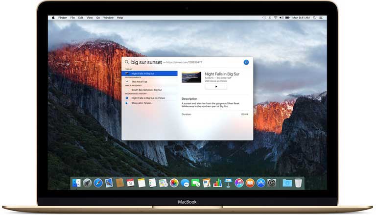Επιπλέον, το παράθυρο προβολής αποτελεσμάτων του Spotlight μπορεί πια να μεγεθυνθεί κατά βούληση, ακόμα και να τοποθετηθεί όπου θέλουμε στον ευρύτερο χώρο της οθόνης, σε αντίθεση με το προγενέστερο OS X Yosemite, όπου εμφανίζονταν αυστηρά στο κέντρο της οθόνης και με συγκεκριμένο μέγεθος παραθύρου. Τέλος, το Spotlight παραμένει να είναι ένα ισχυρό σημείο εύρεσης πληροφοριών, ανάμεσα σε αυτές η πρόγνωση καιρού, χρηματιστηριακές μετοχές και βίντεο από το Διαδίκτυο.