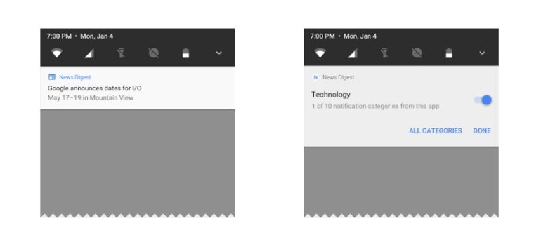 Στις οπτικές αλλαγές, το Android O εισάγει τα notification channels. Αυτά τα «κανάλια» θα δώσουν στους χρήστες τον απόλυτο έλεγχο σε κάθε τύπο ειδοποιήσεων. Οι χρήστες θα μπορούν να μπλοκάρουν ή να αλλάξουν τη συμπεριφορά κάθε καναλιού ξεχωριστά, έτσι ώστε να μην χρειάζεται να σταματήσουν όλες τις ειδοποιήσεις μιας εφαρμογής. Όπως μπορείτε να δείτε στις εικόνες που έχουμε επισυνάψει παραπάνω, το Android O φέρνει αλλαγές στην εμφάνιση των ομαδοποιημένων ειδοποιήσεων. Στα αριστερά φαίνεται ένα screenshot από το Android Nougat και στα αριστερά από το νέο Android O.
