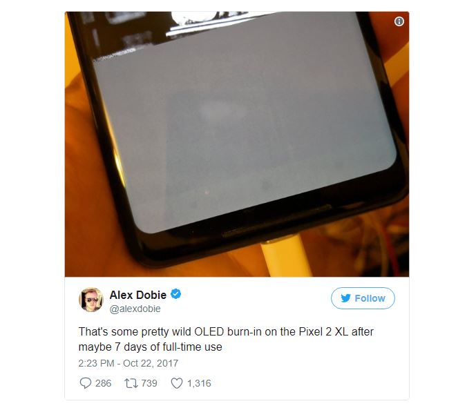 Κάποιοι νέοι κάτοχοι του νέου Google Pixel 2 XL φαίνεται να αντιμετωπίζουν προβλήματα με burn-in της οθόνης. Ο συντάκτης του Android Central, Alex Dobie, ήταν ο πρώτος που ανέφερε κάτι τέτοιο, ο οποίος χρησιμοποιούσε τη συσκευή του ήδη μια εβδομάδα. Στη δική του περίπτωση φαίνεται να έχει γίνει burn-in στα navigation buttons.