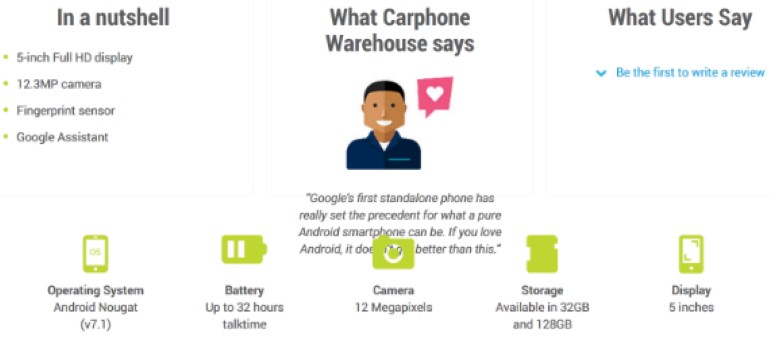 Το Google Pixel έχει πολλά ίδια χαρακτηριστικά με τον μεγαλύτερο αδερφό του αλλά και κάποιες βασικές διαφορές όπως η οθόνη που είναι στις 5 ίντσες AMOLED με ανάλυση 1080×1920 pixels, η μπαταρία είναι 2770mAh, ζυγίζει 143 γρ. και έχει διαστάσεις 143×69.5 χλστ.