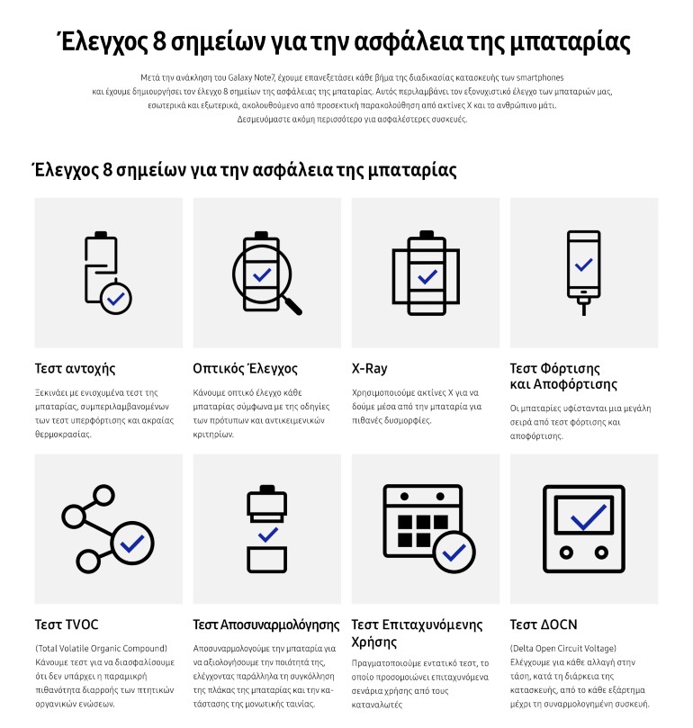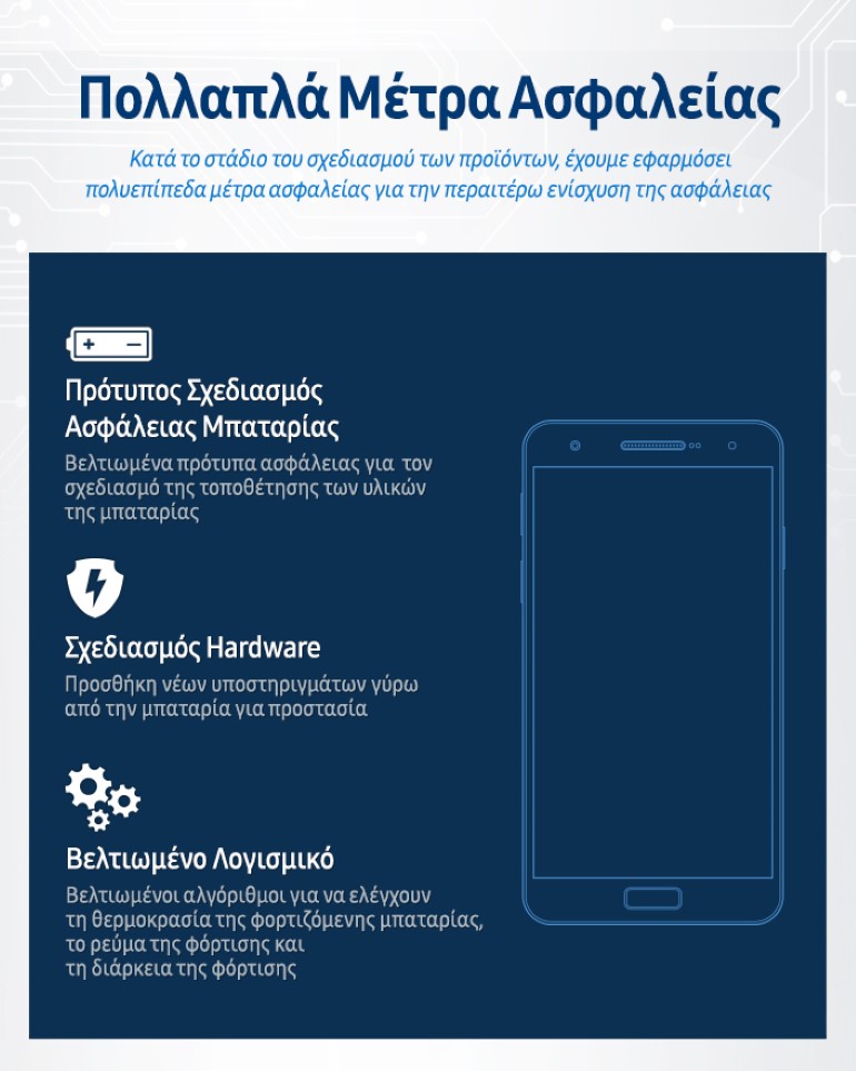 Εκτός από τη δική μας έρευνα για τα περιστατικά αυτά, προσλάβαμε επίσης ανεξάρτητους οργανισμούς εμπειρογνωμόνων του κλάδου, συμπεριλαμβανομένης της UL, της Exponent και της TUV Rheinland, για να παρέχουν αντικειμενική και αμερόληπτη ανάλυση. Η έρευνα μας, καθώς και οι έρευνες που ολοκληρώθηκαν από τους τρεις ανεξάρτητους οργανισμούς του κλάδου, κατέληξαν στο συμπέρασμα ότι οι μπαταρίες ήταν η αιτία σχετικά με τα περιστατικά του Note 7. Παρόλα αυτά, εμείς θέσαμε τον στόχο για τις προδιαγραφές της μπαταρίας του καινοτόμου Note 7 και εμείς αναλαμβάνουμε την ευθύνη για την αποτυχία μας να εντοπίσουμε και να ελέγξουμε τα θέματα που προέκυπταν από τον σχεδιασμό της μπαταρίας και από τη διαδικασία κατασκευής πριν από την κυκλοφορία του Note 7.