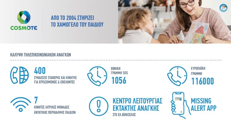 Δεκαεφτά χρόνια η COSMOTE υποστηρίζει το έργο του Οργανισμού «Το Χαμόγελο του Παιδιού», προσφέροντας προηγμένες τεχνολογικές λύσεις και τηλεπικοινωνιακές υπηρεσίες, που διευκολύνουν το έργο του σωματείου για την φροντίδα των παιδιών και την αντιμετώπιση περιστατικών εξαφάνισης στην Ελλάδα.