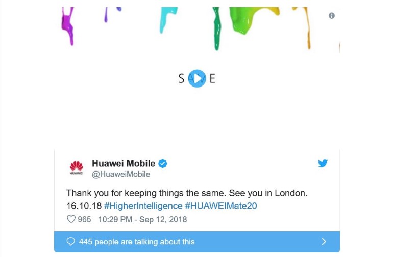H εταιρεία αναφέρει στην ίδια ανάρτηση ότι “μας περιμένουν” στο Λονδίνο στις 16 Οκτωβρίου, που είναι και η ημέρα παρουσίασης της σειράς Mate 20. Η Huawei με αυτοπεποίθηση μας λέει ότι η νέα της ναυαρχίδα θα πάει πέρα από την “συνέπεια”, τον “ορίζοντα” και τη “νοημοσύνη”.