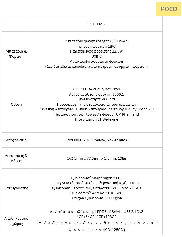 Το POCO M3 διατίθεται σε δύο παραλλαγές (με διαφορετικές μνήμες και διαφορετικό αποθηκευτικό χώρο), 4GB+64GB και 4GB+128GB αντίστοιχα.