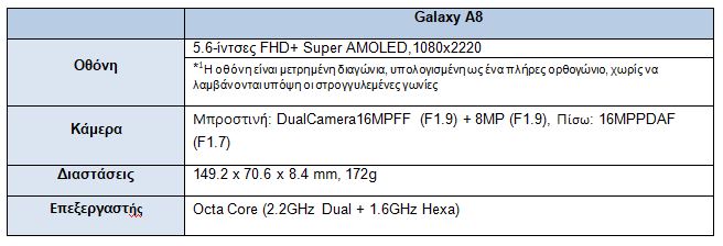 Η Samsung Electronics Co. Ltd παρουσιάζει την πρόσφατη προσθήκη στη σειρά GalaxyA: το Galaxy A8. Το Galaxy A8 διαθέτει διπλή μπροστινή κάμερα, μεγάλη οθόνη χωρίς όρια (Infinity) και εντυπωσιακό εργονομικό σχεδιασμό που αντλεί στοιχεία από την κληρονομιά και την εμπειρία της ναυαρχίδας της Samsung. Με πρόσθετες λειτουργίες για καθημερινή χρήση, η σειρά Galaxy A είναι πιο στιλάτη, πρακτική και άνετη από ποτέ.