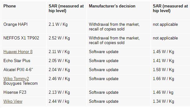 Από τις 8 συσκευές, οι 6 έλαβαν ενημέρωση λογισμικού και κατόπιν μειώθηκε η τιμή του SAR τους. Οι άλλες δύο αποσύρθηκαν από τη γαλλική αγορά. Οι δύο που αποσύρθηκαν ήταν το Orange HAPI και το NEFFOS X1 TP902.
