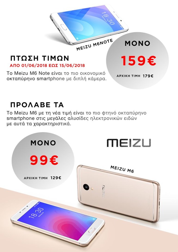 Η Meizu Greece ανακοίνωσε σήμερα ότι για 15 ημέρες θα μπορούν οι καταναλωτές να προμηθευτούν τα Meizu M6 και Meizu M6 Note σε προνομιακή τιμή.
