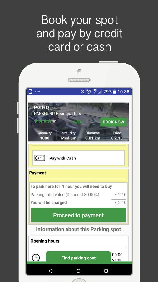 Η χρήση του App είναι πολύ απλή. Οι οδηγοί κατεβάζουν την εφαρμογή στο κινητό τους, εισάγουν τον προορισμό τους και το PARKGURU εμφανίζει διαθέσιμους χώρους στάθμευσης και το κόστος τους. Ο οδηγός μπορεί να πληρώσει μέσω της εφαρμογής, κάνοντας χρήση πιστωτικής κάρτας ή με μετρητά στο σταθμό parking κατά την αποχώρησή του.