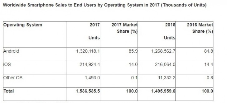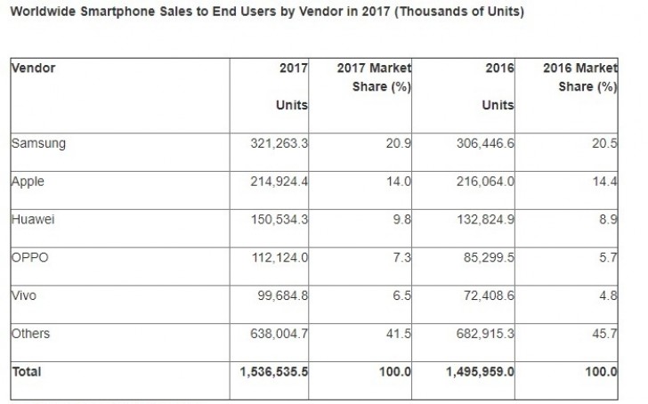 Ενώ τα αποτελέσματα του 4ου τριμήνου ήταν πιο ανατρεπτικά, τα ετήσια αποτελέσματα είχαν θετικό πρόσημο με τις συνολικές πωλήσεις για το 2017 να αυξάνονται σε σχέση με το 2016 από τα 1,495 δισ. στα 1,536 δισ. Οι πέντε κορυφαίοι κατασκευαστές διατήρησαν τις θέσεις τους, με την Samsung να ηγείται μπροστά από την Apple, τη Huawei, την Oppo και τη vivo.