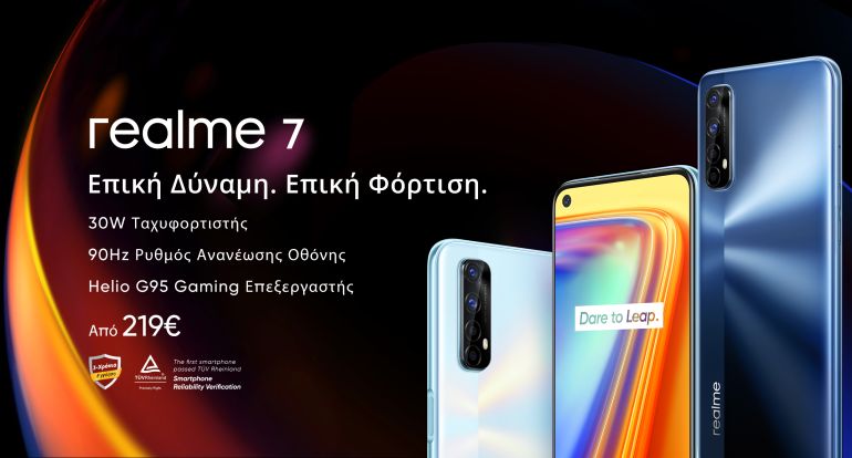Οι gamers θα απολαύσουν την επική δύναμη και επική φόρτιση του νέου realme 7, με τον πρώτο παγκόσμιο επεξεργαστή παιχνιδιών MTK Helio G95, φορτιστή 30W DartCharge, μπαταρία 5000mAh και οθόνη 90Hz Ultra Smooth. Το realme 7, το πιο επικό τηλέφωνο gaming μεσαίας κατηγορίας, είναι διαθέσιμο για αγορά στα συνεργαζομενα σημεία λιανικής καθώς και online με προτεινόμενη τιμή από 219€.