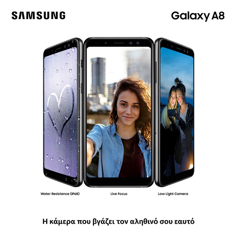 Το εξαιρετικά λεπτό (5,4 mm) με ενιαίο μεταλλικό σχεδιασμό και γυαλί Gorilla Glass 4 Samsung Galaxy A8 διαθέτει οθόνη 5,6” FHD+ super AMOLED 440 ppi με αναλογία εικόνας 18.5:9, διπλή selfie κάμερα 8MP και 16 MP που εστιάζει σε πραγματικό χρόνο για εξαιρετικές φωτογραφίες, 4GB RAM, αναγνώριση προσώπου και αισθητήρα δακτυλικού αποτυπώματος! Είναι επίσης κατασκευαστικά ανθεκτικό με πιστοποίηση IP68.