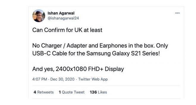Μια καταχώρηση στη Βραζιλία επίσης επιβεβαιώνει ότι τα Galaxy S21, S21 Plus και S21 Ultra θα πωλούνται χωρίς φορτιστές. Στο πακέτο πιθανώς θα βρείτε μόνο καλώδιο USB-C σε USB-C, ενώ η εταιρεία αναμένεται να κυκλοφορήσει έναν νέο φορτιστή στα 30W, που θα κοστίζει μάλιστα λιγότερο από αυτόν στα 25W που είναι ήδη στην αγορά.