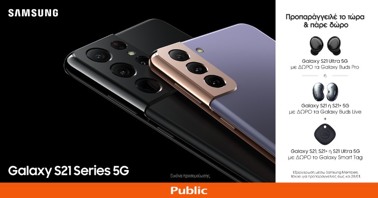 Το Public.gr, ο μεγαλύτερος online προορισμός τεχνολογίας στην Ελλάδα, υποδέχεται την ολοκαίνουργια σειρά smartphone Galaxy S21 Series 5G της Samsung: H καλύτερη σειρά Galaxy έως τώρα, έρχεται για να συναρπάσει τους λάτρεις των social media και της τεχνολογίας. Οι προπαραγγελίες ξεκίνησαν στο public.gr από 14 Ιανουαρίου και θα διαρκέσουν ως και 28 Ιανουαρίου.
