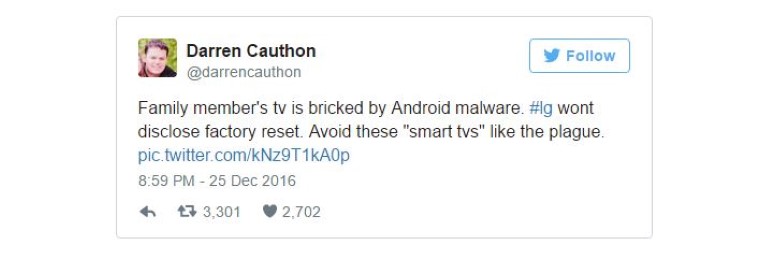 Ο Darren Cauthon κοινοποίησε στο Twitter μια φωτογραφία από Smart TV συγγενή του, η οποία προσβλήθηκε από ransomware και οι hackers ζητούν $500 για να την ξεκλειδώσουν (εμφανής και η πλαστή ειδοποίηση από το FBI).