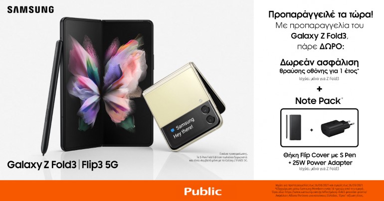 - Αν είσαι Samsung Member, με κάθε προπαραγγελία του Galaxy Z Fold3, απόκτησε δωρεάν ασφάλιση θραύσης οθόνης για 1 έτος αλλά και ένα χρήσιμο Note Pack, που περιλαμβάνει θήκη Flip Cover με S Pen & 25W Power Adapter.