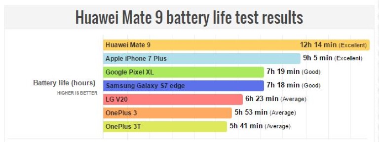 To Mate 9 κατάφερε και κρατήθηκε ενεργό 12 ώρες και 14 λεπτά, ενώ το iPhone 7 Plus έφτασε τις 9 ώρες και 5 λεπτά, με το Samsung Galaxy S7 Edge να φτάνει τις 7 ώρες και 18 λεπτά (περίπου μισή διάρκεια ζωής μπαταρίας από το Huawei Mate 9).