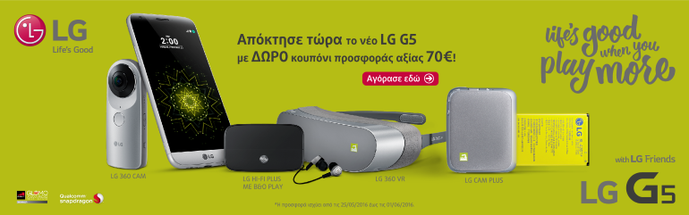 Η LG Electronics (LG) ξεκινά τη διαθεσιμότητα του πολυ-αναμενόμενου smartphone, LG G5, στην ελληνική αγορά από σήμερα, 25 Μαΐου. Το smartphone έχει ήδη ξεχωρίσει για την κομψότητα, το μεταλλικό του φινίρισμα με slide out αποσπώμενη μπαταρία και τον modular σχεδιασμό ο οποίος εξασφαλίζει μια πραγματικά μοναδική εμπειρία χρήσης, ενώ με τη βοήθεια των LG Friends, μια σειρά εξωτερικών συσκευών, το G5 μπορεί να μετατραπεί σε ψηφιακή κάμερα, hi-fi player και πολλά ακόμη. Η LG Electronics Hellas με αφορμή την ανακοίνωση της διαθεσιμότητας του LG G5 στην ελληνική αγορά, προσφέρει κουπόνι προσφοράς αξίας 70€ στους καταναλωτές που θα το αγοράσουν από σήμερα, Τετάρτη 25 Μαΐου, μέχρι και την 1η Ιουνίου.