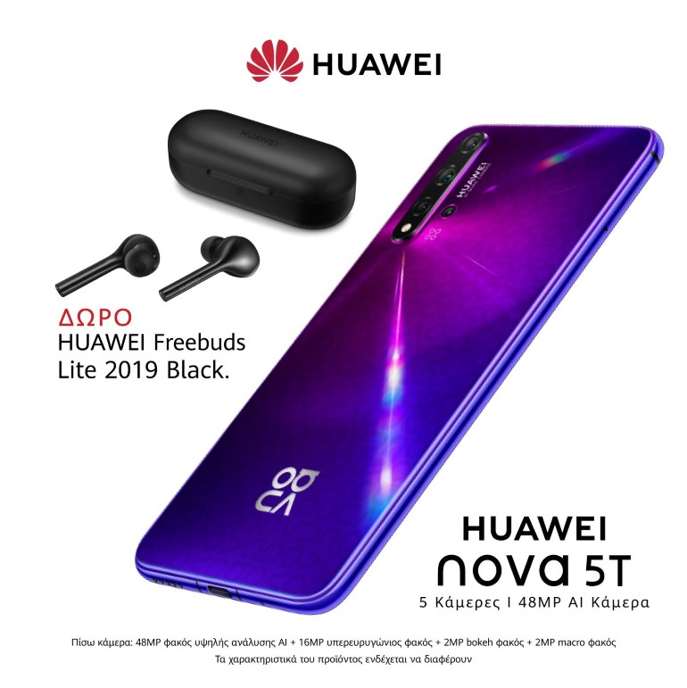 Το HUAWEI nova 5T είναι διαθέσιμο για προπαραγγελία από τις 8 έως τις 14 Νοεμβρίου 2019. Δώρο με κάθε προπαραγγελία τα Freebuds Lite σε μαύρο χρώμα. Εκμεταλλευτείτε την προσφορά και δείτε την καθημερινότητά σας να απογειώνεται.