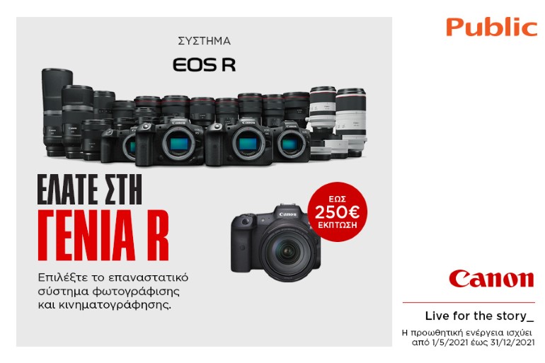 Το Public καλωσορίζει τη νέα γενιά φωτογραφικών μηχανών Canon EOS R. Το νέο, πρωτοποριακό σύστημα πλήρους καρέ της Canon EOS R, θέτει νέα πρότυπα στο κόσμο της φωτογράφισης και της κινηματογράφησης! Επισκέψου τώρα το public.gr ή ένα κατάστημα Public και επίλεξε μια κάμερα ή ένα φακό Canon της νέας σειράς EOS R κερδίζοντας έκπτωση έως και 250€.