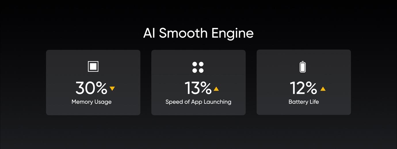 Στο realme UI 3.0, προστίθεται ένα νέο AI smooth σύστημα, που μειώνει σημαντικά τα επίπεδα κατανάλωσης ενέργειας. Η συνολική χωρητικότητα έχει βελτιωθεί, ο «κατακερματισμός» της μνήμης έχει ελαχιστοποιηθεί και διάφορες εφαρμογές εκκινούνται έξυπνα χάρη στη συμπίεση μνήμης AI και τον ενοποιημένο προγραμματισμό πόρων. Αυτό, μειώνει τη χρήση μνήμης κατά 30%, βελτιώνει τη συνολική απόδοση εκκίνησης εφαρμογών κατά 10% και αυξάνει τη διάρκεια ζωής της μπαταρίας κατά 12%.